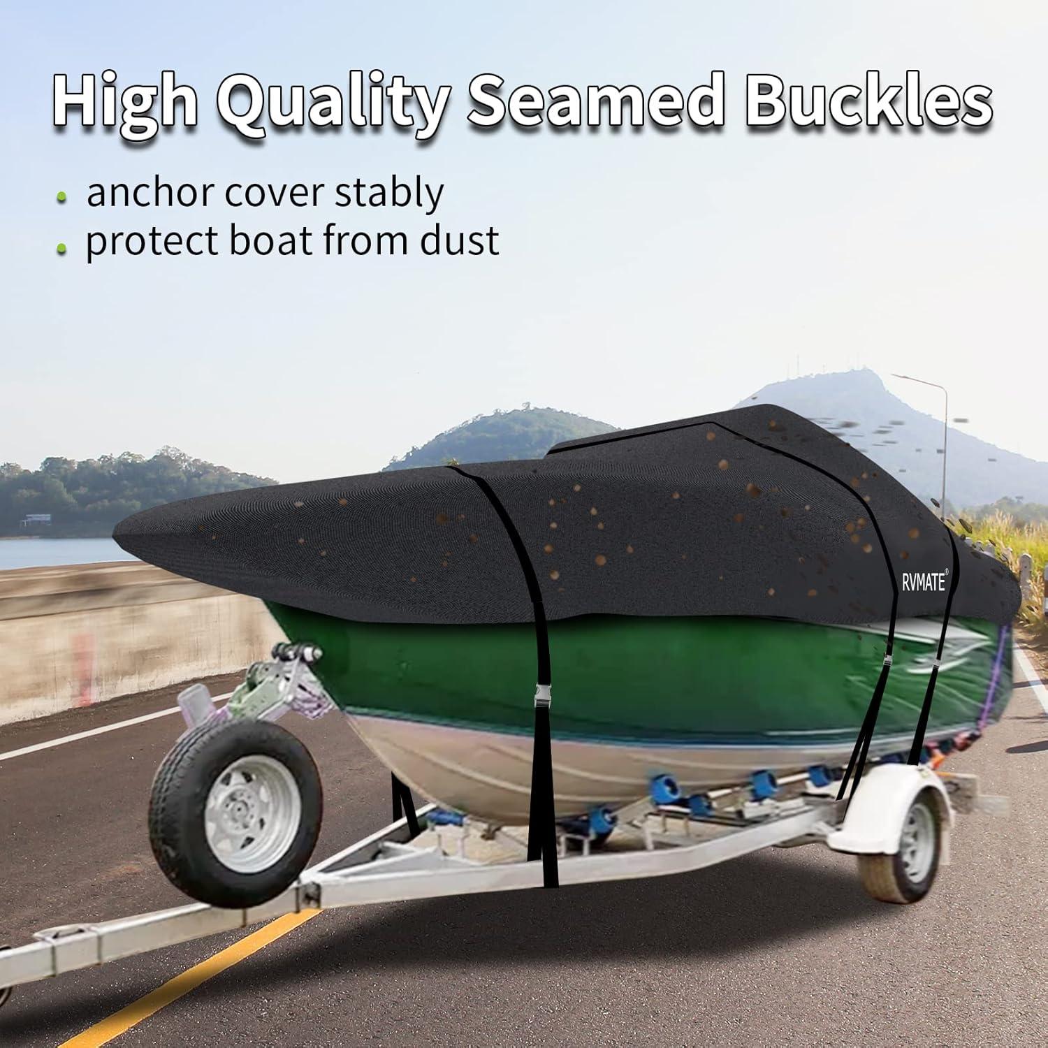 Elastic hem and adjustable buckle keep boat cover in position while mooring and highway travel. Protect your boat from dust and dirt.