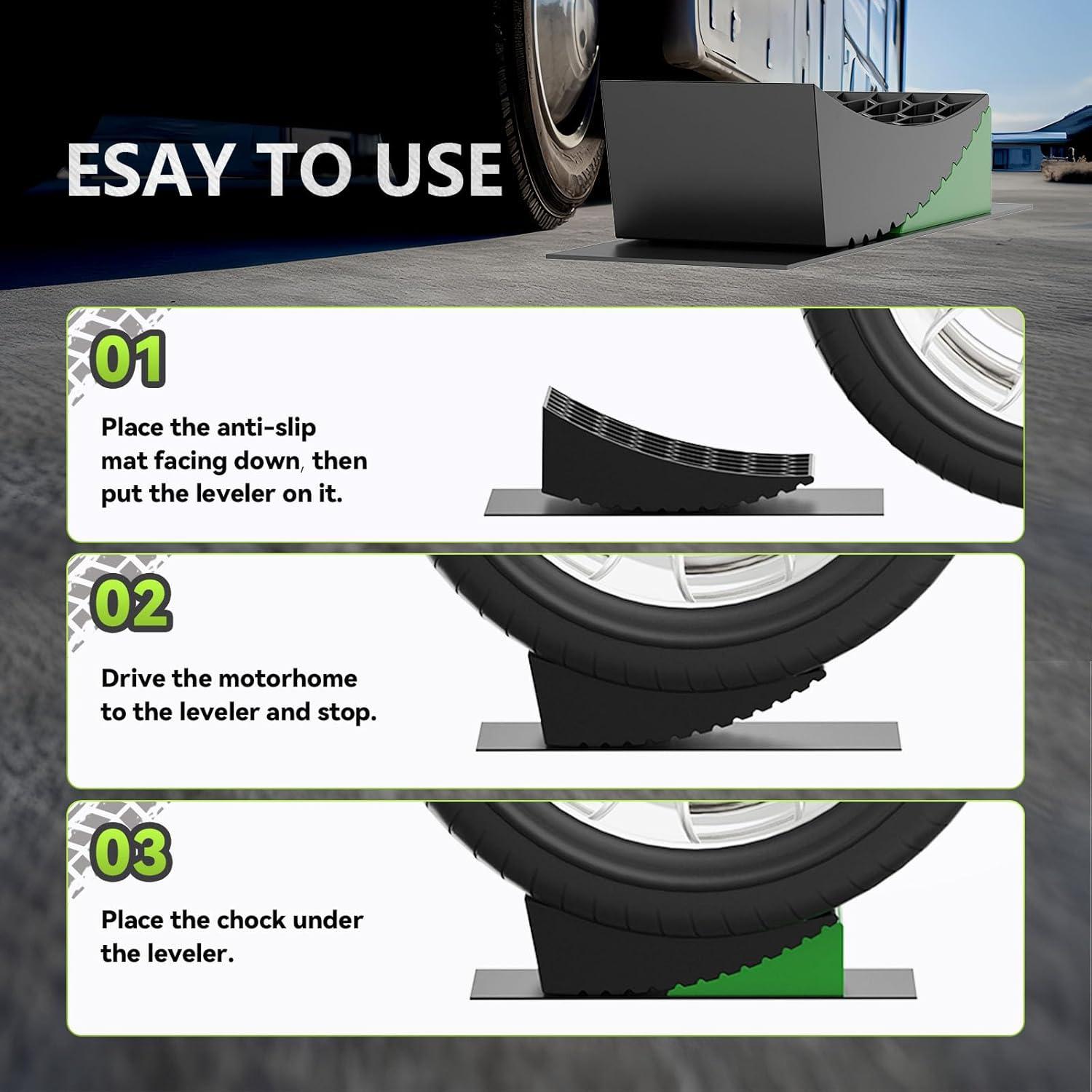 EASY TO USE: Put the anti-slip mat before placing the curved leveler. Drive the motorhome onto the leveler and stop at the height you want to achieve. Then add the chock under the leveler. Designed with perfect size to be compatible with dual axles wheel without trimming.