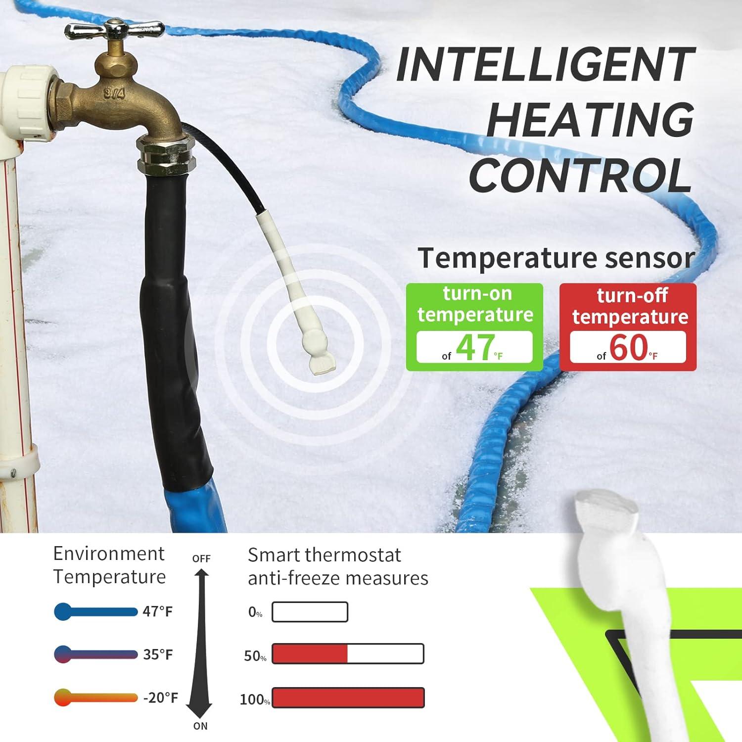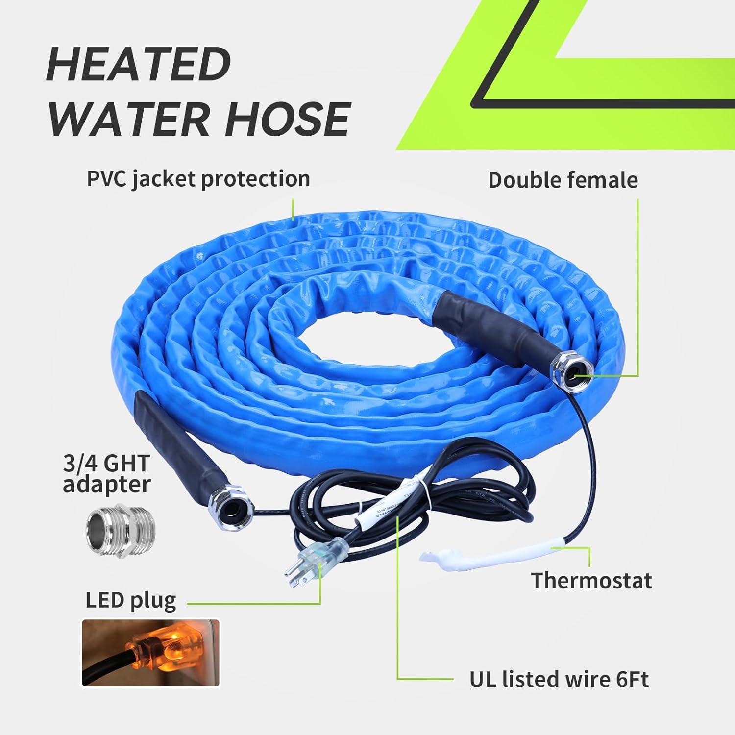 Multi-scenario Application: Heated water hose with intelligent heating control can keep the water flowing even in freeze temps, provides freeze protection down to -20°F (-28°C). Ideal to ensure water supply whether in the RV, garden or camping in winter. Heavy duty heated wire with UL, the output power was increased to 7 watts/ft to improve the efficiency of the product.
