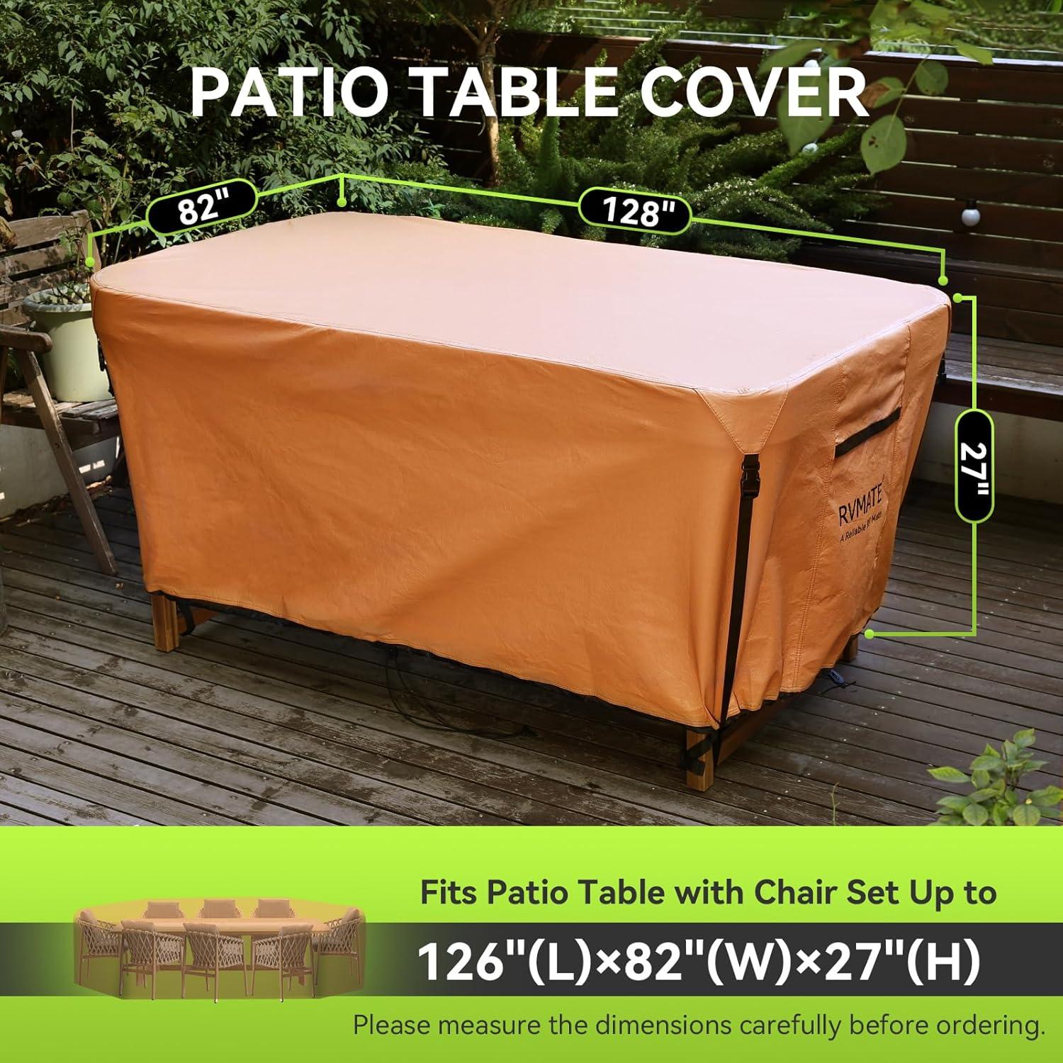 RVMATE Rectangular Patio Table Cover, Heavy Duty Vinyl Waterproof Patio Furniture Cover, for Outdoor Dining Table and Chairs, Fit up to 126L x 82W x 27H inch