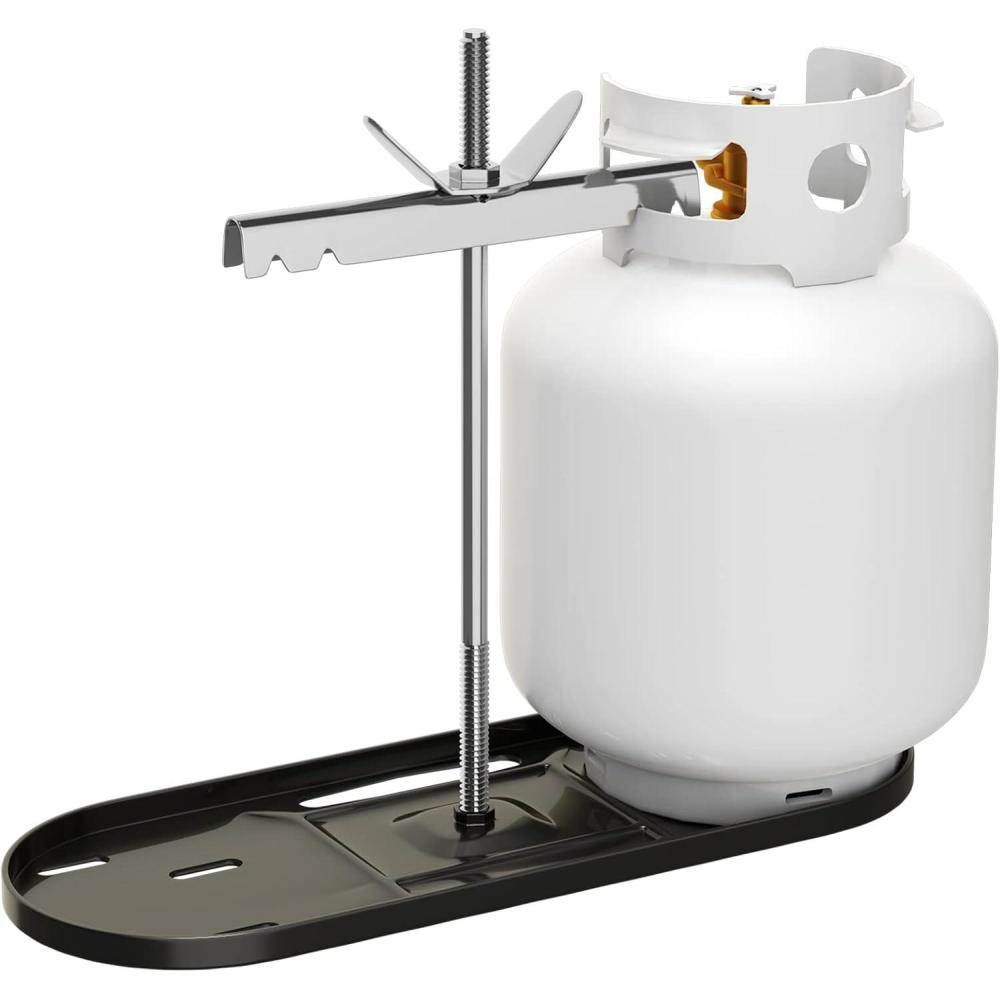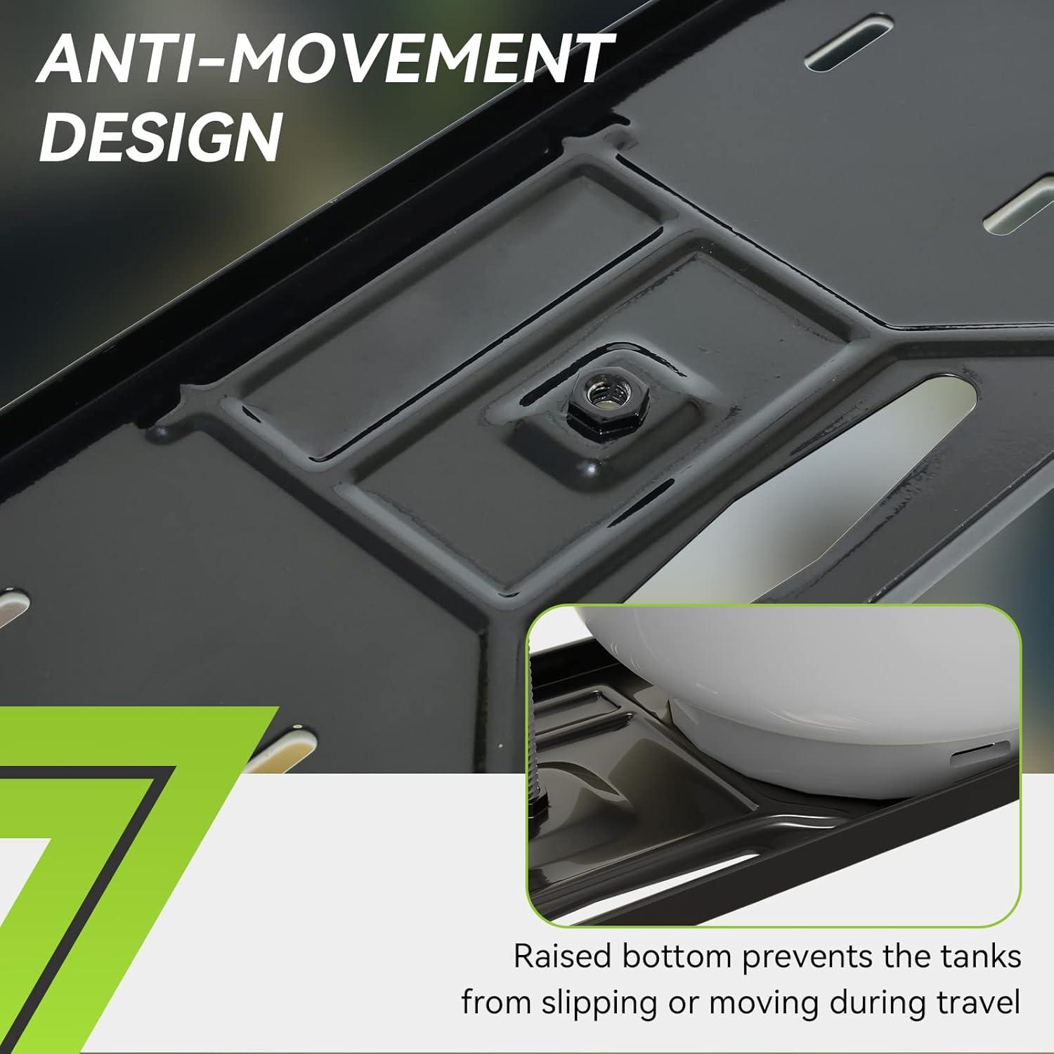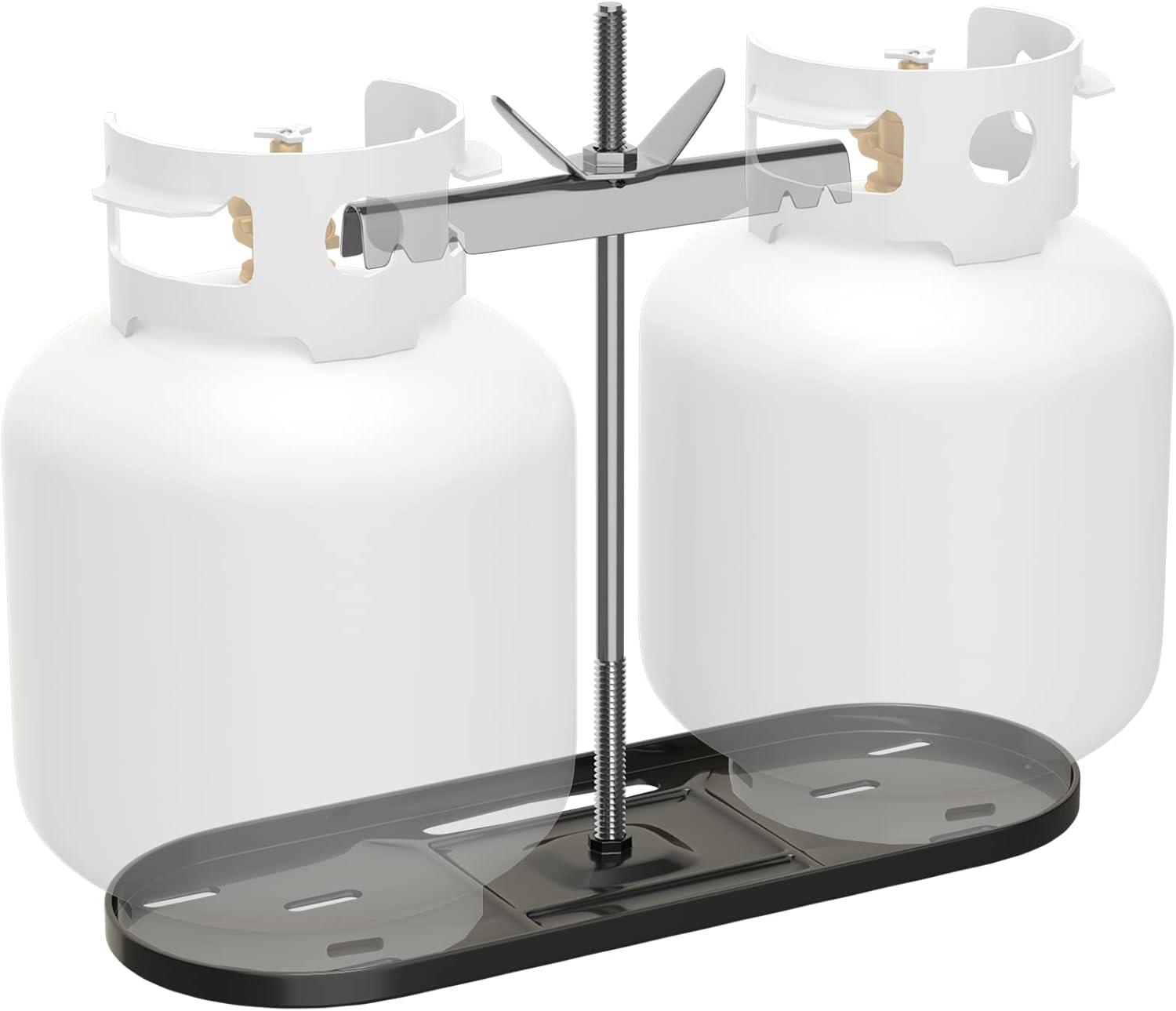 This tank mounting Rack securely holds two 20 pounds propane tanks.