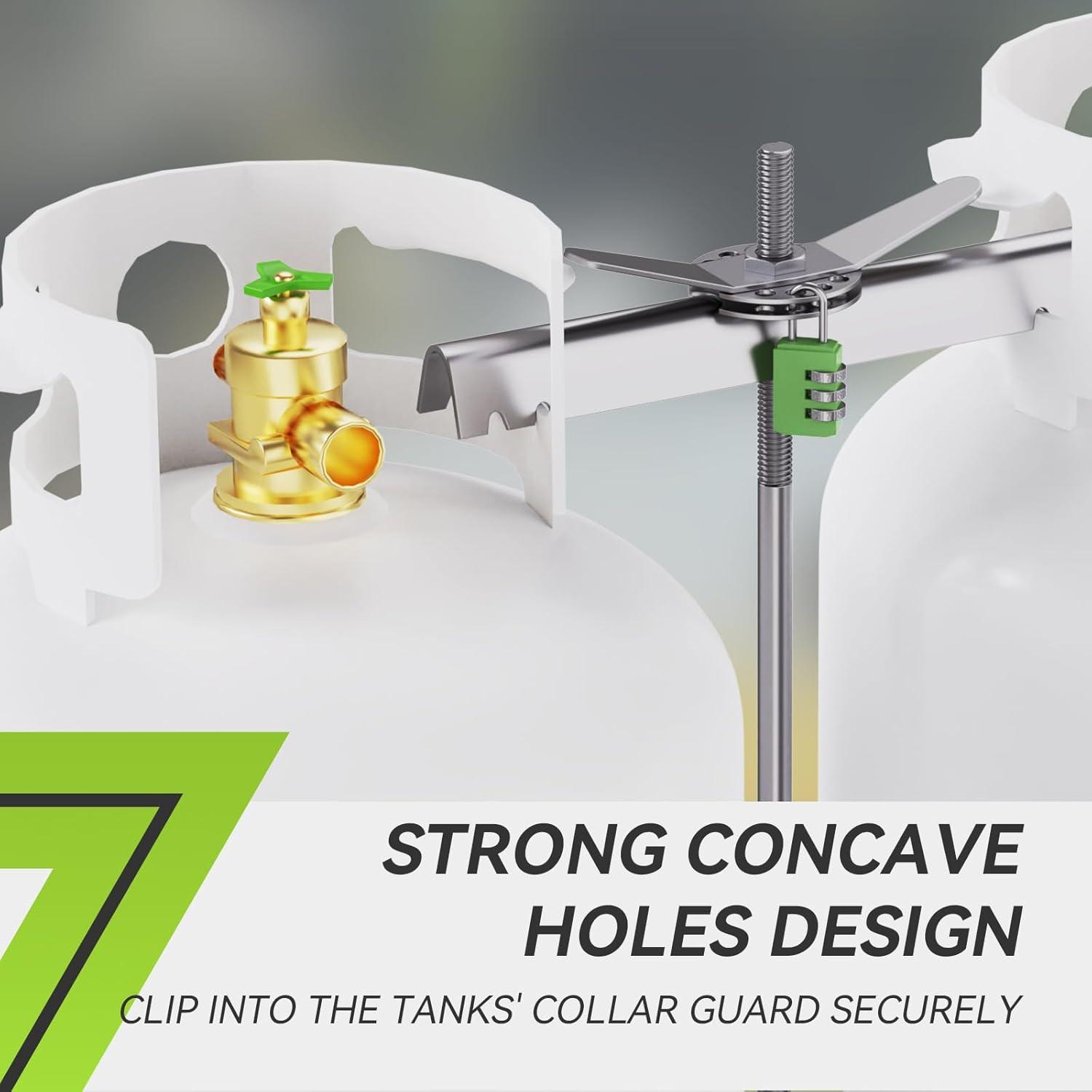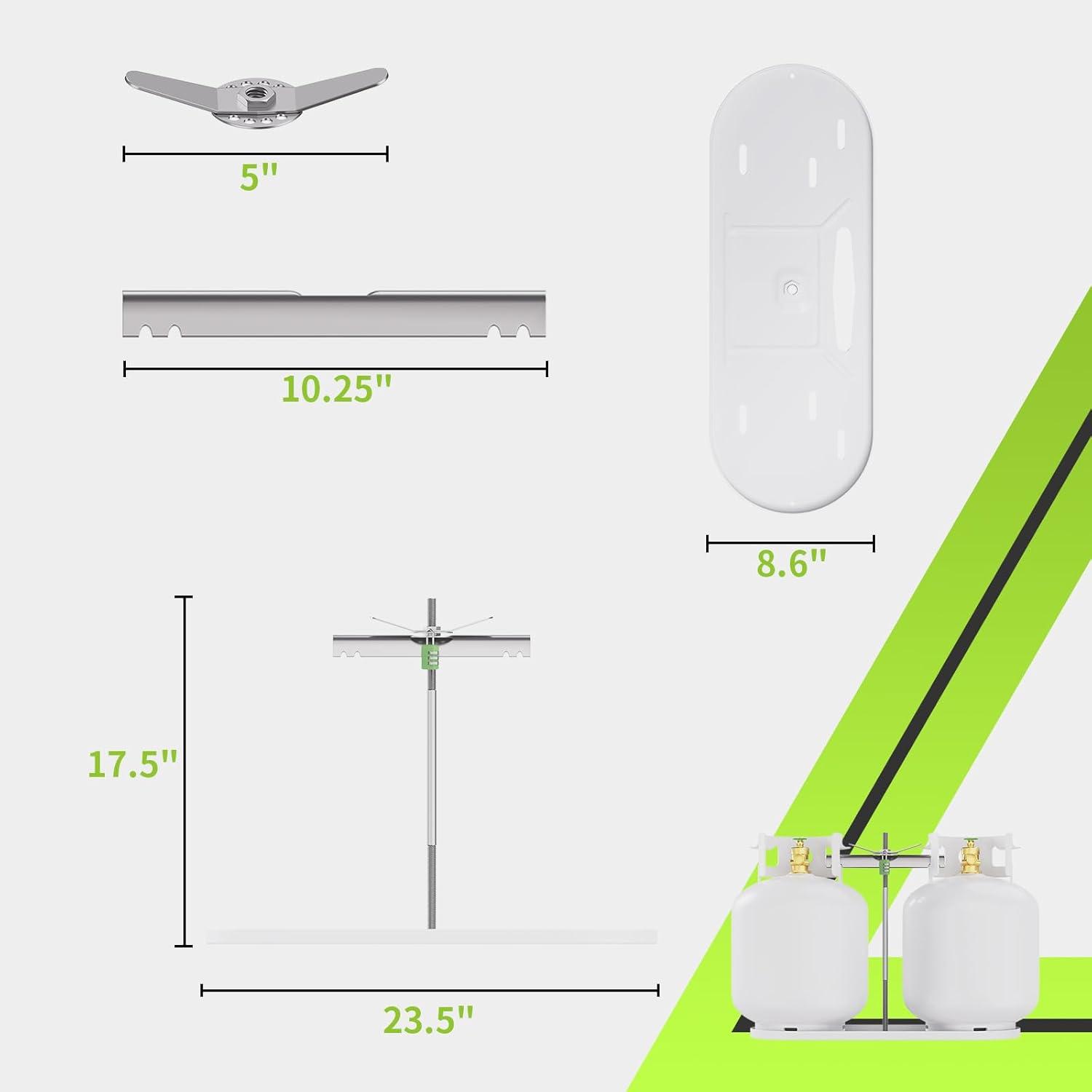 SIZE: This tank mounting rack securely holds two 20-pound propane tanks. You can adjust the distance between the fuel tanks and the height of the T-bracket as required. The bottom tray is 23.5″ wide by 0.63″ deep overall, the bar size is 17″ max for the 20-pound tank.