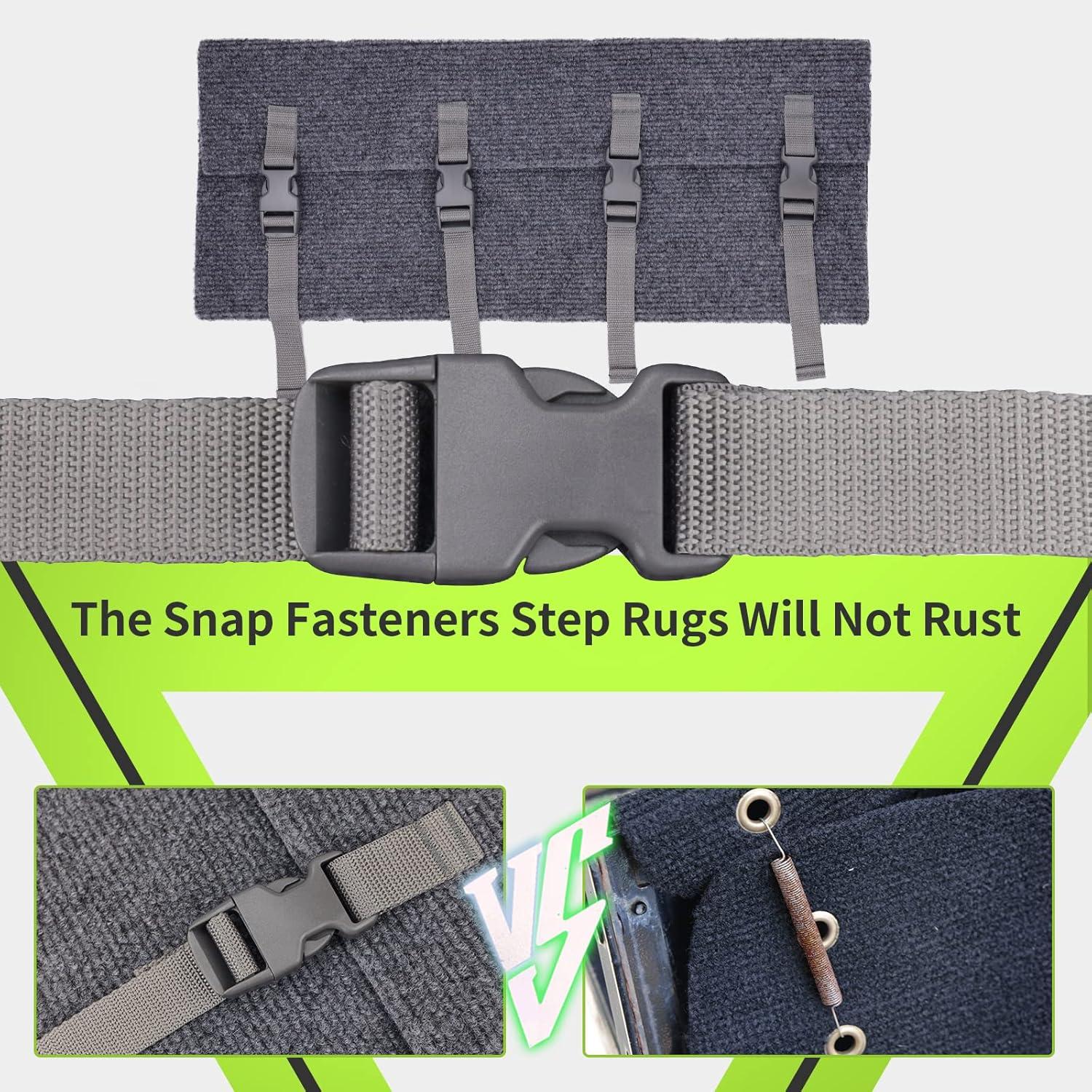 Size and New Design: Each carpet is 22 inches long and 23 inches wide. Compared to those types with spring hooks, the special snap fasteners will assist you to quickly fit and release the step rugs, and moreover it will not rust under any weather condition with the benefit of longer service life and not easily being lost away.
