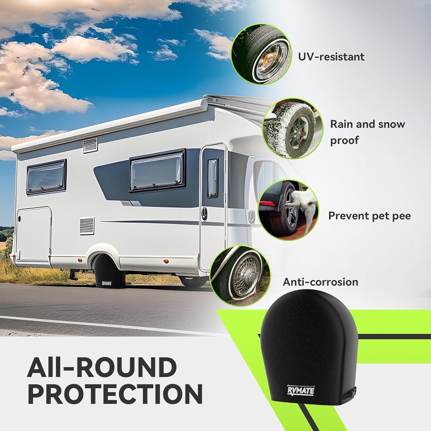 【Function】RVMATE RV tire covers are made of heavy-duty vinyl material with UV-resistant and waterproof surface, protecting your tires from sunlight, snow, rust and dirt. Keep your tires in good condition even in bad weather.