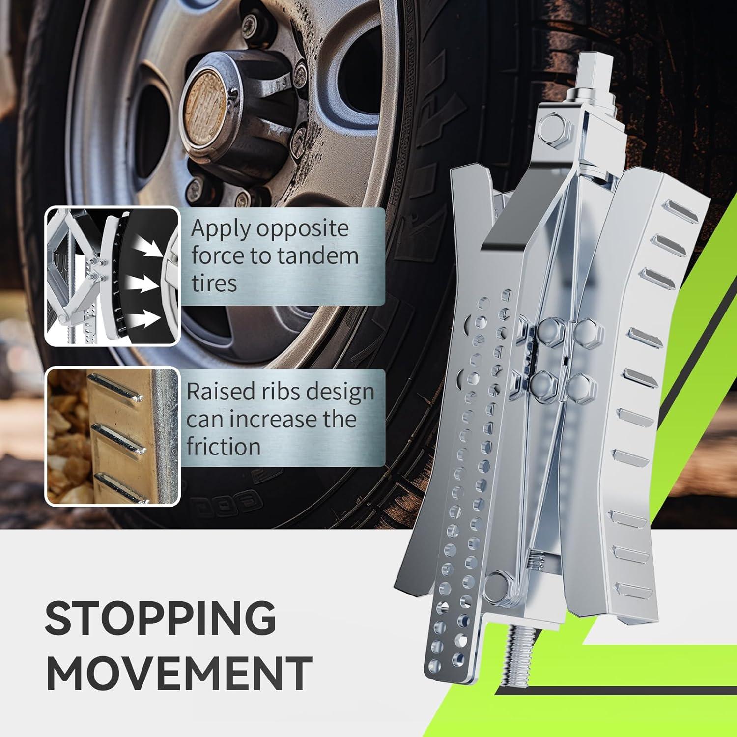 🚩【NEW DESIGN & SIZE】The rotating sides of the wheel chock make it more convenient to expand or retract. The expansion space ranges from 4.8″ to 11.8″. You will need to measure the size between your RV's tandem tires before ordering.
