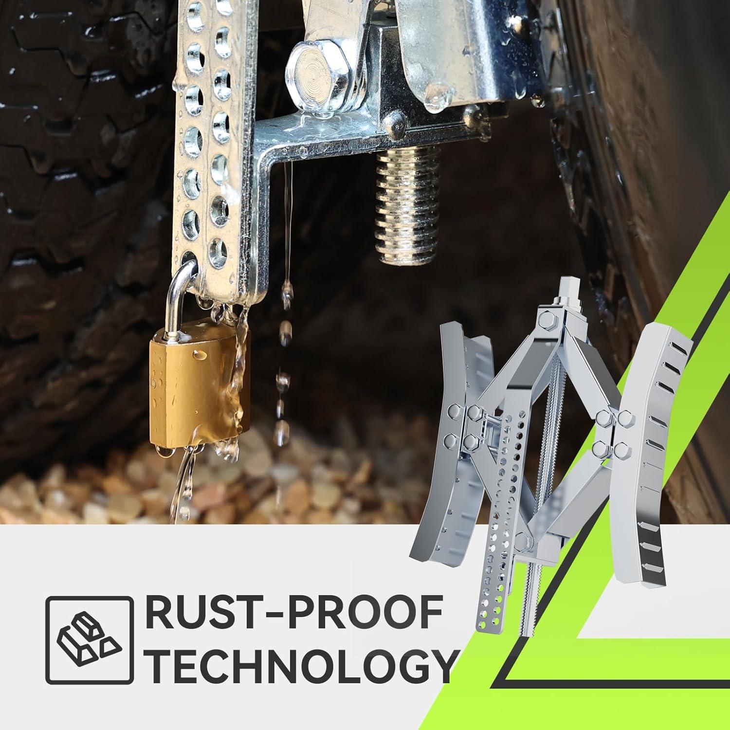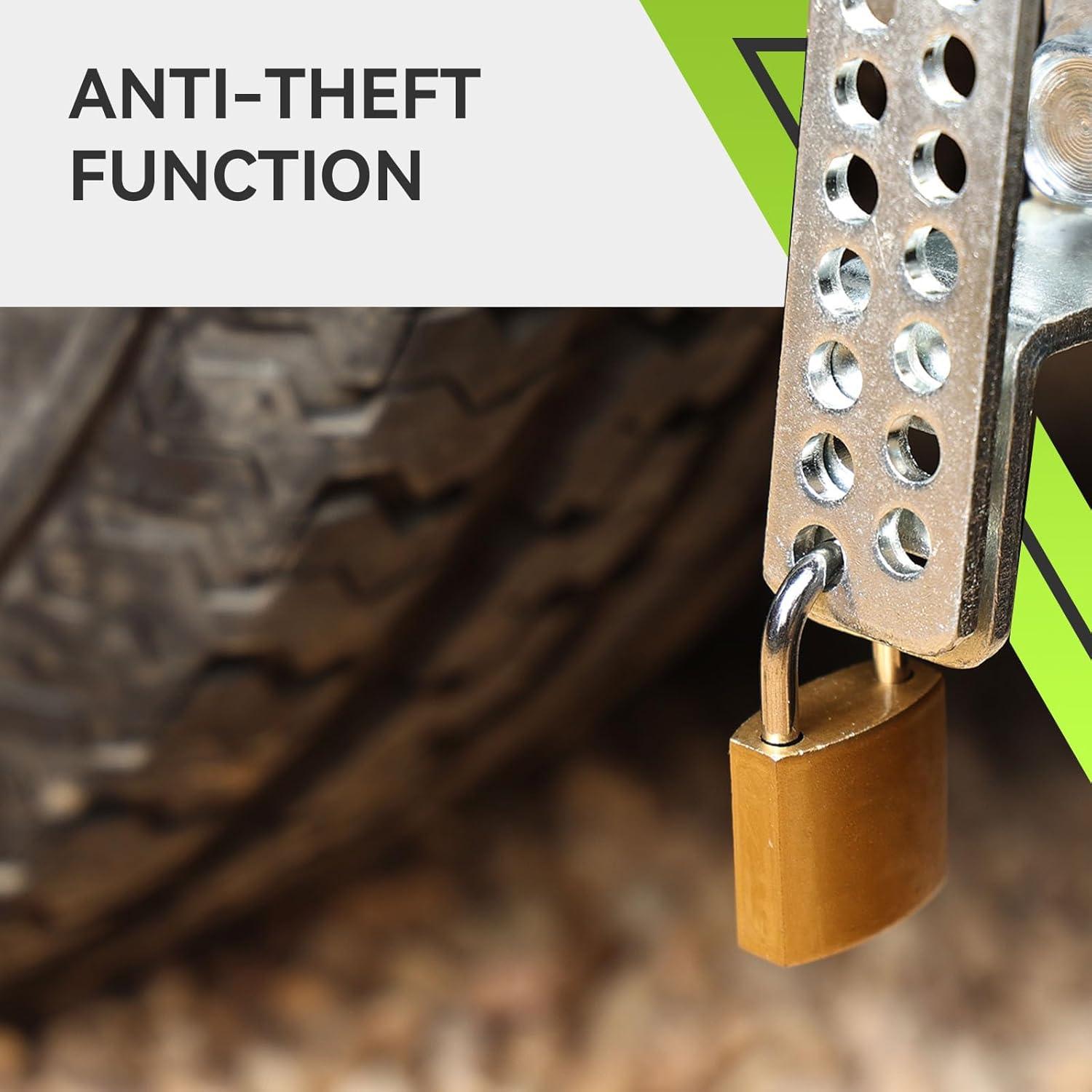 🚩【SAFETY】There are two rows of holes on the wheel chock to choose. When the wheel chock is expanded to the appropriate position, the hole can be locked with our lock. The thief cannot steal the wheel chock by retracting it,which has the function of anti-theft and safety.